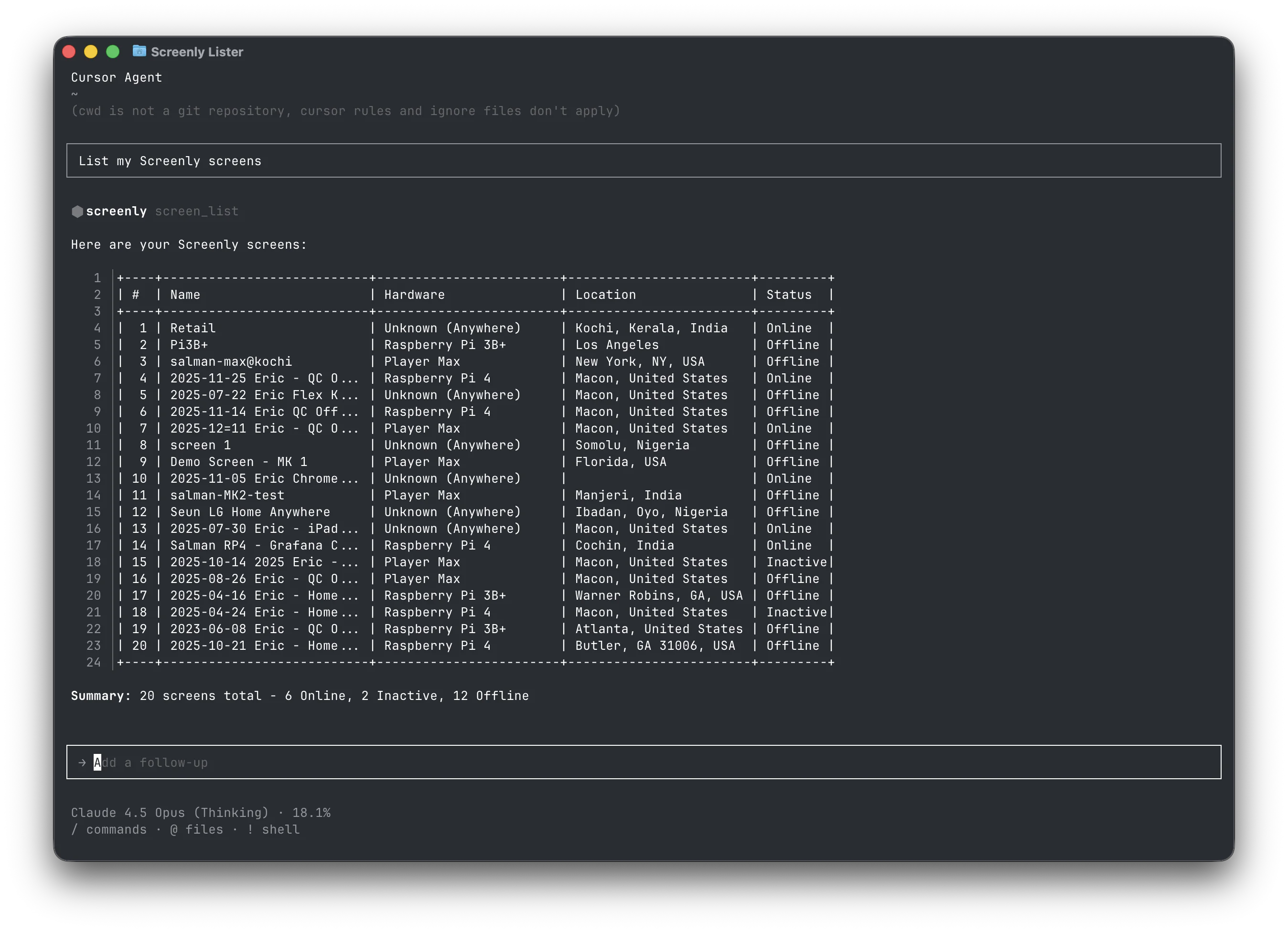 agent chat "Using the Screenly tools, list all screens and show which ones are offline."